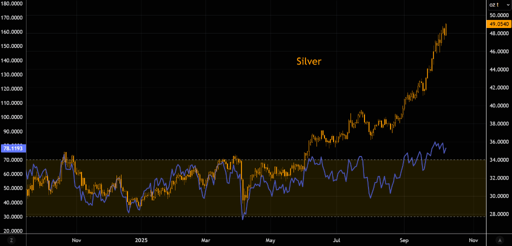 而市场的“沸腾”并不仅限于黄金。白银涨势更为迅猛,年内涨幅超67%跑赢黄金,价格逼近50美元。