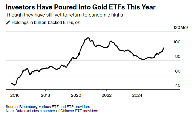 疫情期间,部分规模最大的黄金ETF持仓量曾飙升至历史峰值,但随后因投资者获利了结,持仓量进入长期下滑通道。2024年年中,这种资金外流趋势终于逆转,自那以来,流入这些基金的黄金已超过1600万盎司。不过,当前ETF持仓量较疫情期间高点仍相去甚远——对于早已着眼于下一个里程碑的黄金多头而言,这无疑是一个充满希望的信号。