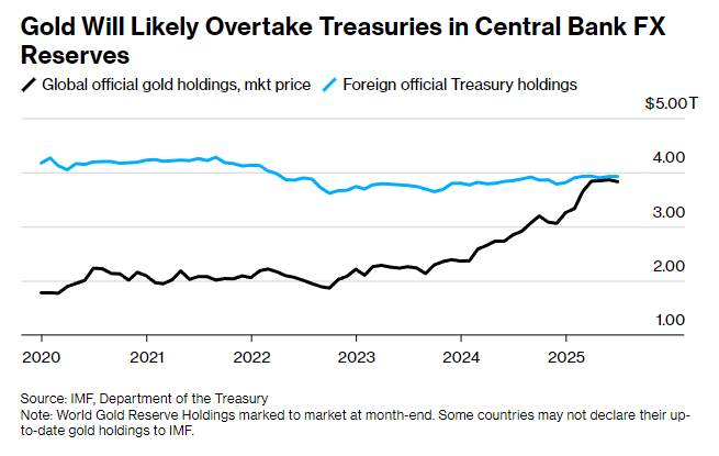 尽管黄金或许永远无法恢复昔日全球货币体系基石的地位,但其当前价值几乎可以肯定已远超非美央行外汇储备中持有的美国国债规模。虽然与全球外汇储备中所有美元计价债务的总量相比,黄金仍有较大差距,但今年早些时候,黄金已超越欧元,成为各大央行外汇储备中的第二大资产。